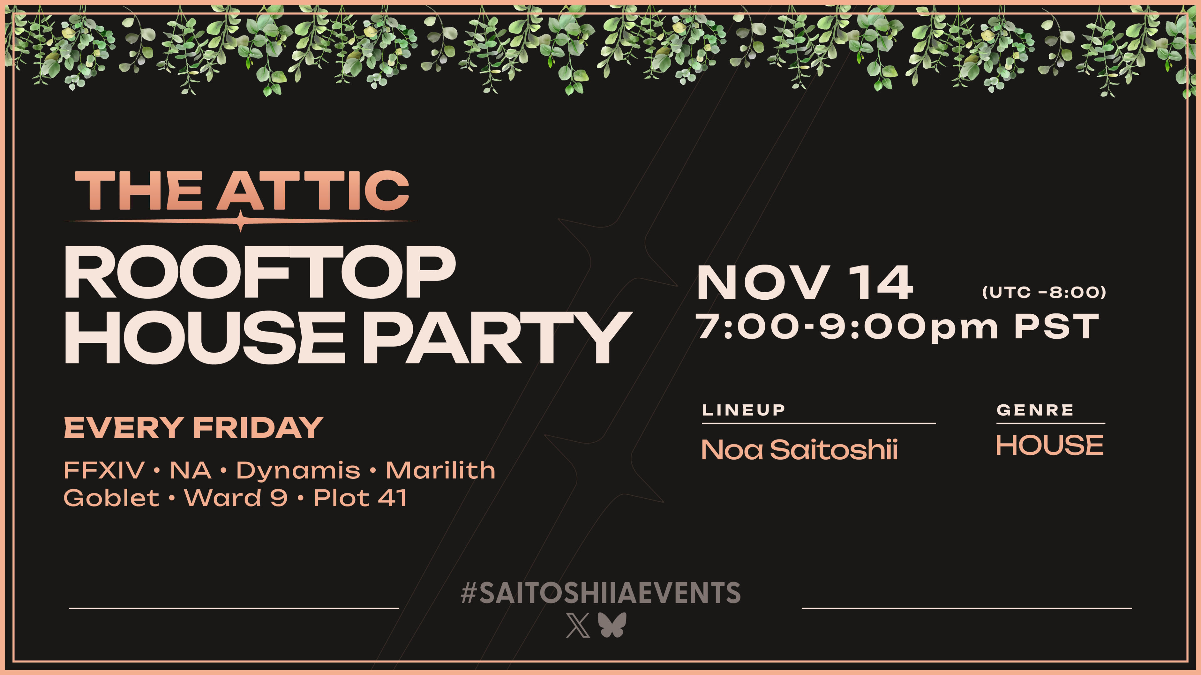 Nature-infused rooftop looking out to the city skyline at sunset. The perfect backdrop for a night (or morning) of partying! That is what The Attic is all about. A smaller and more intimate space within the Saitoshiia nightclub family that has just the right blend of cozy, nature infused warmth and lively, dance all night energy.This space serves not only as a new regular stop for Saitoshiians every Friday but also a space for spontaneity, where you can expect the unexpected! From surprise guest DJs to crazy pop-up parties, there's always something new on it's way!Follow Noa's Socials!
