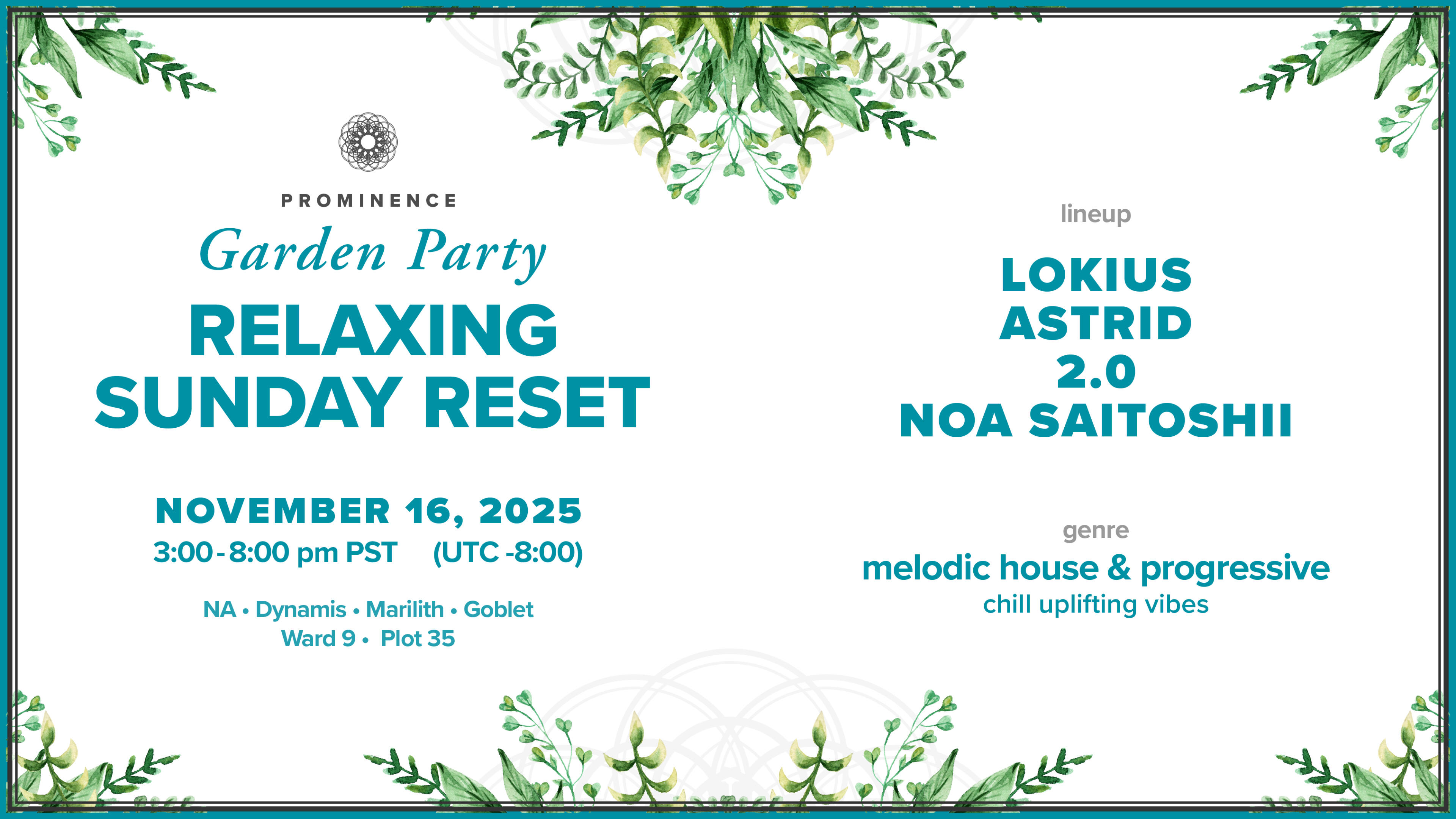 | Nov 16 | Prominence: Garden Party | Lokius // Astrid // 2.0 // Noa Saitoshii | 3-8pm PST |