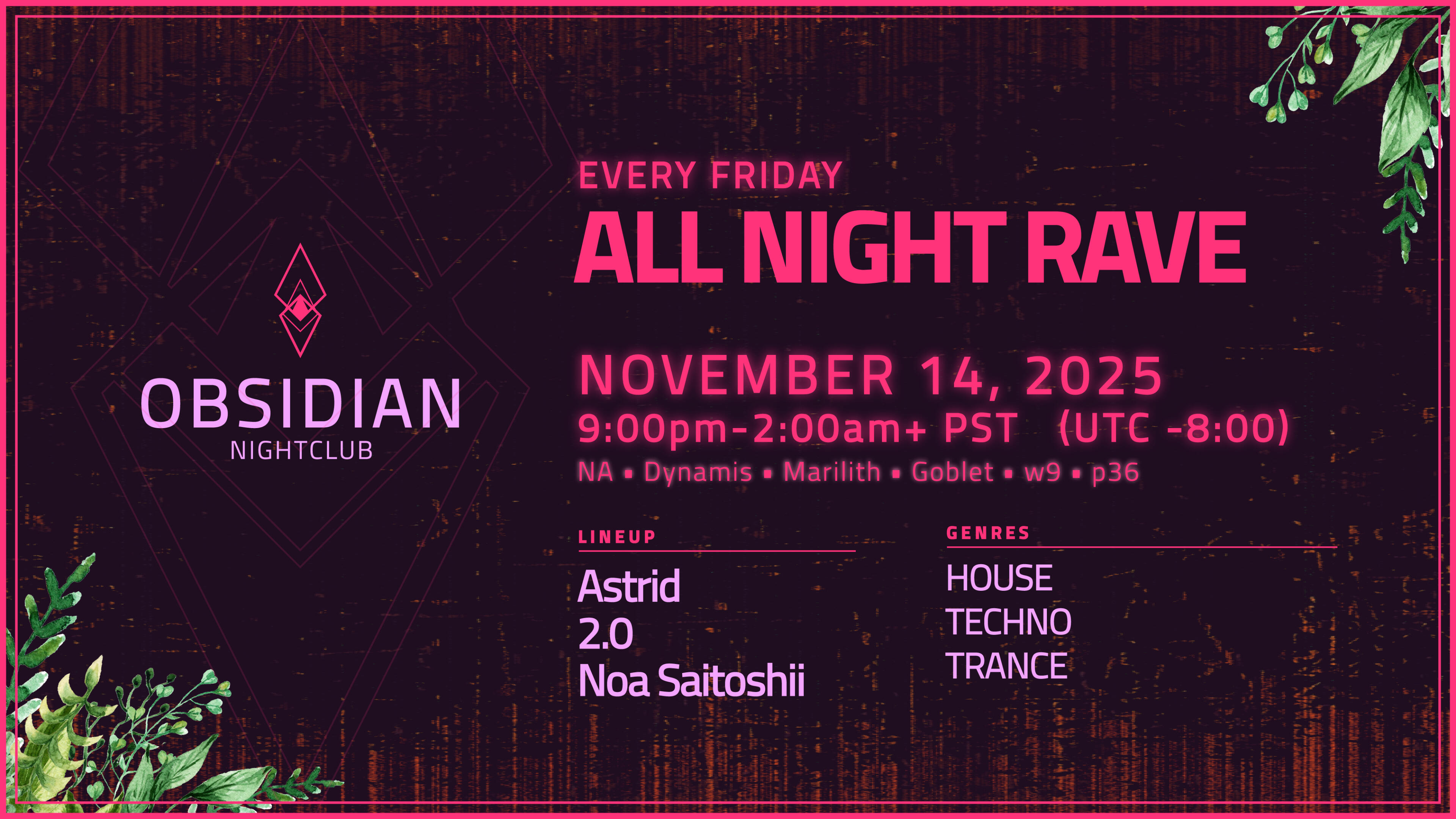 | Nov 14 | Obsidian | Astrid // 2.0 // Noa Saitoshii | 9pm-2am+ PST |